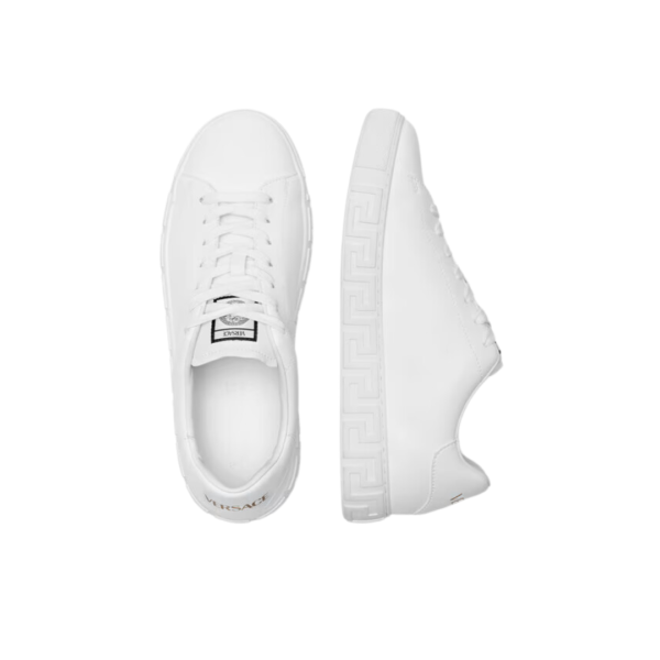 A silhueta de cano baixo é caracterizada por um padrão Greca gravado nas solas vulcanizadas. Um logo estampado na parte traseira complementa o estilo. Esses tênis Greca possuem 43% de materiais responsáveis e são 100% livres de componentes de origem animal. A nova temporada dos tênis Greca é feita com materiais sustentáveis, utilizando conteúdo reciclado certificado e/ou originado de fontes renováveis.