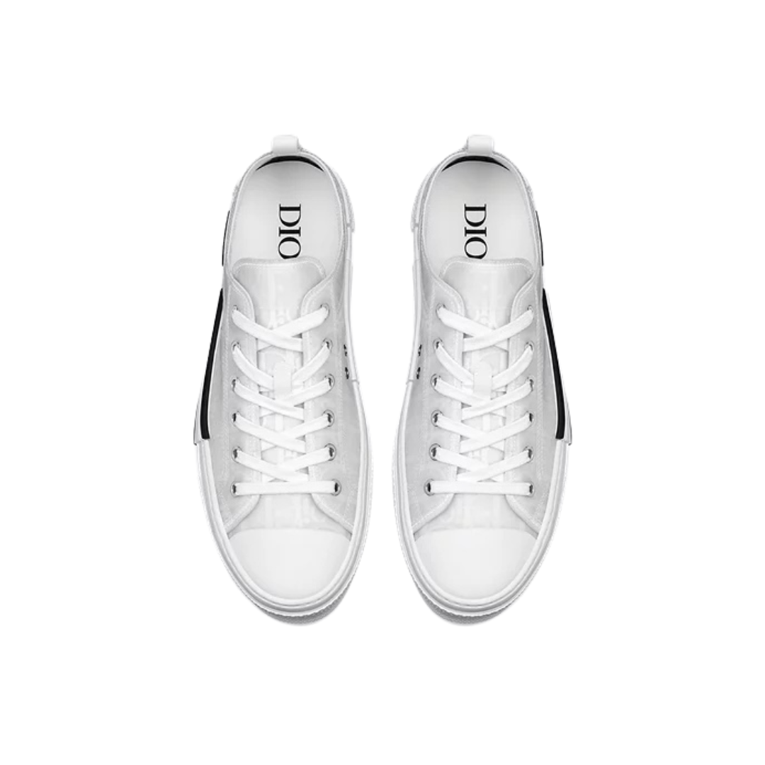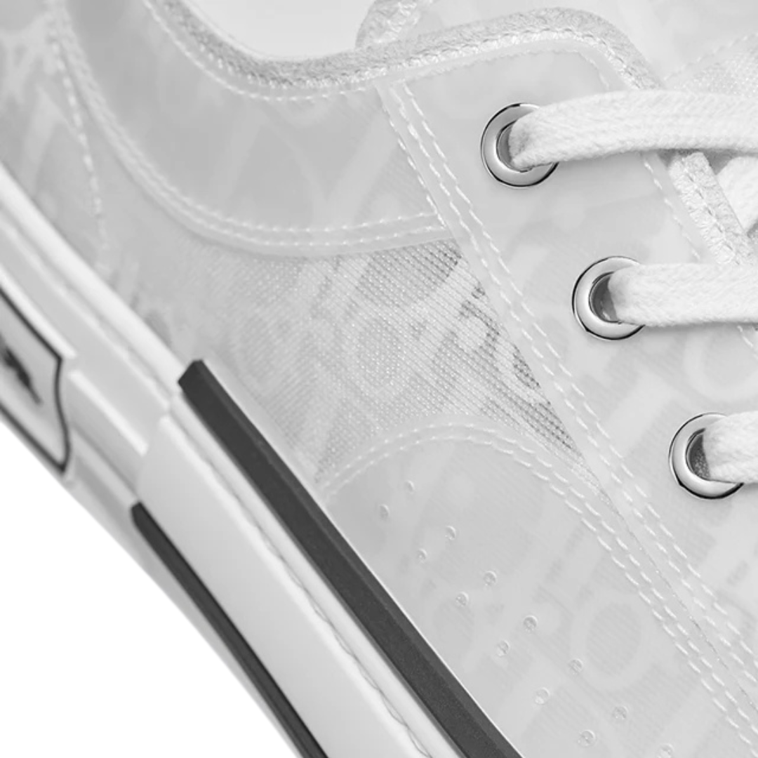Este sneaker de cano curto B23 destaca-se por sua sobreposição de telas transparentes e canvas Dior Oblique branco. Detalhes essenciais como ilhoses e frente com cadarço, sola de borracha branca, bico redondo reforçado e puxador no calcanhar lembram os códigos do clássico modelo de cano curto. Ele é aprimorado com detalhes contrastantes nas laterais, incluindo uma inscrição “DIOR”, e combina facilmente com looks casuais.