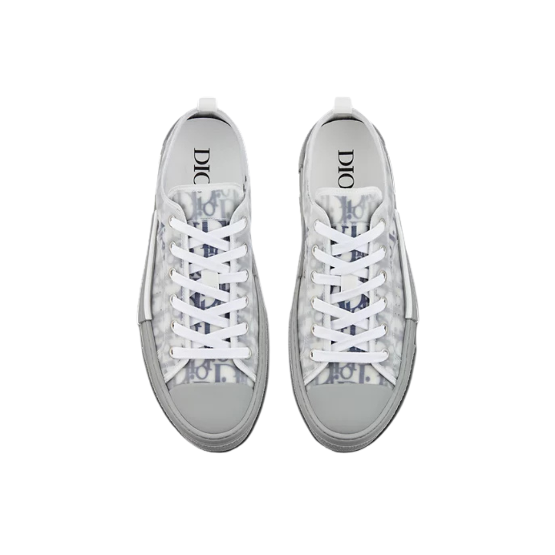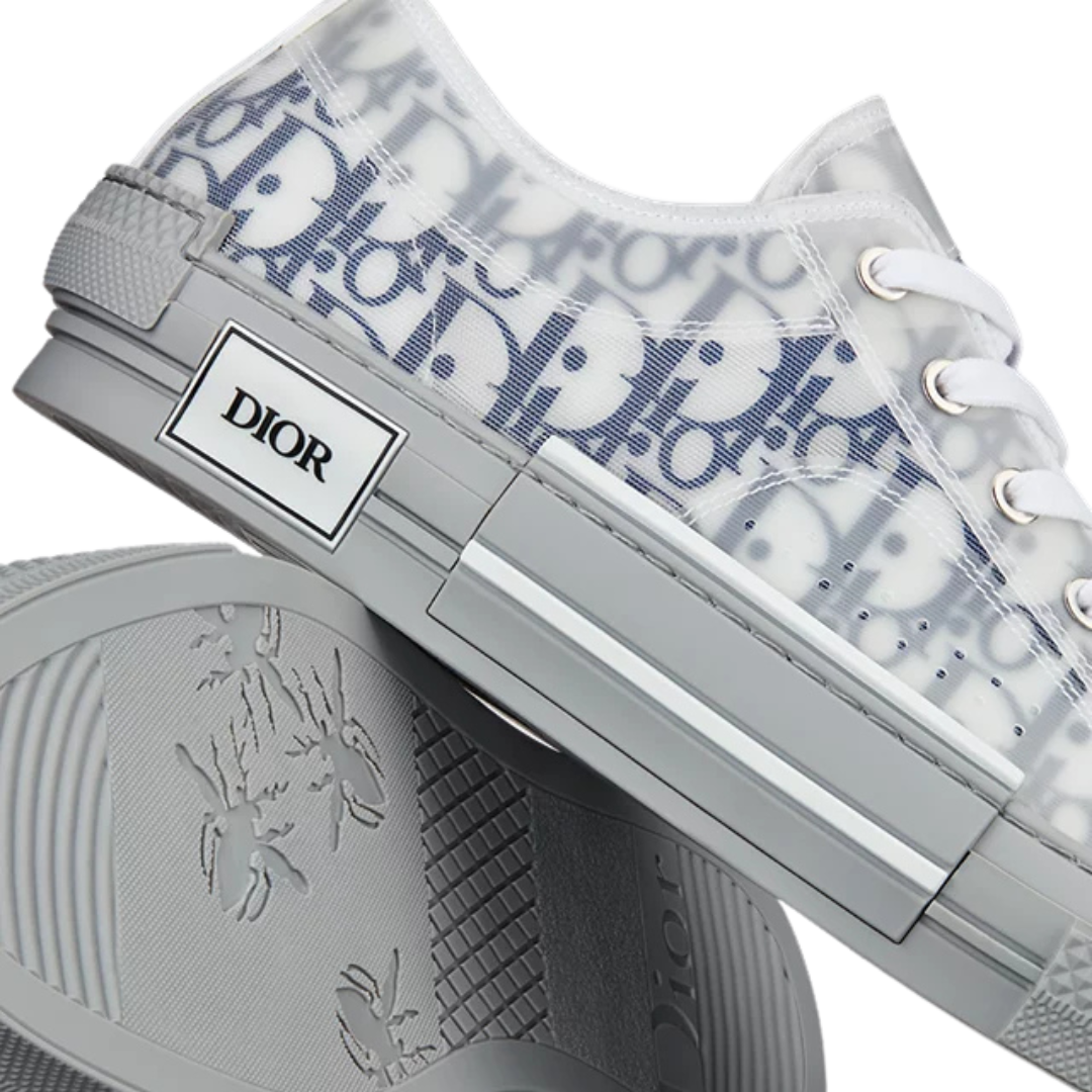 Este sneaker de cano curto B23 destaca-se por sua sobreposição de telas transparentes e canvas Dior Oblique branco e azul-marinho. Detalhes essenciais como frente com cadarço e ilhoses, sola de borracha cinza, bico arredondado reforçado e puxador no calcanhar lembram os códigos do clássico modelo de cano curto. Ele é aprimorado com detalhes contrastantes nas laterais, incluindo uma inscrição “DIOR”, e combina facilmente com looks casuais.